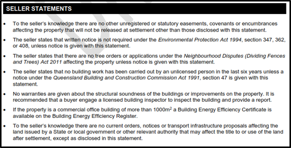 Figure 2 Seller Statements from Draft Seller’s Disclosure Notice (Queensland Government, 2022)
